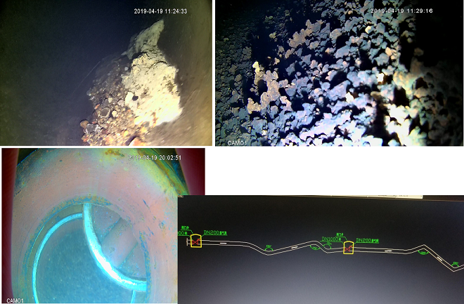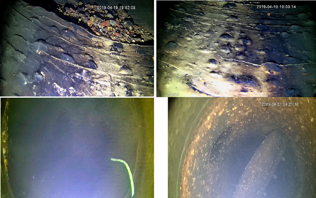 本次试验管段始建于1993年,为预应力钢筋混凝土管,管径1000mm,管道埋深4~6米。管段长2100米,分为2次检测,一段900米,一段1200米。除漏点定位外,机器人还对管道内部运行状态进行了拍照、录像。