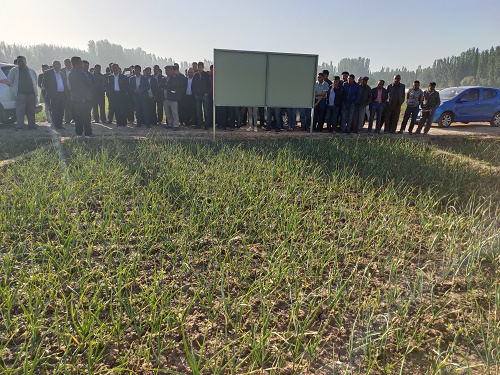 清风网讯(拜城县康其乡人民政府:古丽扎帕尔·巴拉提 邓河丹)2019年5月15日,拜城县康其乡曲结村紫皮大蒜示范田迎来了30多位观摩者,前来参观紫皮大蒜示范田的的示范效果,学习紫皮大蒜优质高产的施肥管理技术。康其乡曲结村支部书记吐尔地·买买提忙的不亦乐乎,热情的迎接前来参观的康其乡、各村支部书记,种植蔬菜大户。