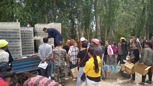 5月17日,新疆地矿局第八地质大队驻拜城县托克逊乡阔纳协海尔村工作队利用扶贫项目资金9.6万元为128户贫困户发放了6400只拜城油鸡苗,领到鸡苗的村民脸上挂满了笑容。