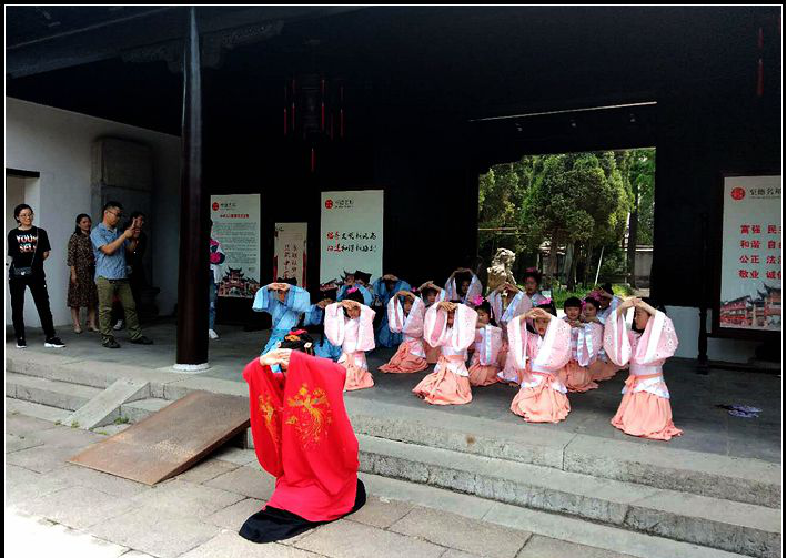 清风网讯 (高华 崔寿伟)为了进一步弘扬传文化,传承国学经典,5月19日下午,泰伯庙文保所悦梅里第四期——汉服礼仪活动在江苏省无锡市新吴区梅村泰伯庙举行, 32位来自梅村街道各社区的学生和家长们身着汉服,在辅导老师的指导下,认真地学习汉服礼仪,传承汉文化之礼。
