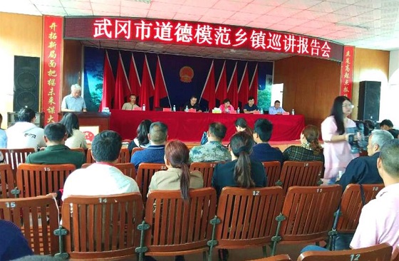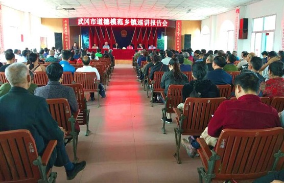 清风网邵阳讯(通讯员:武刚仁. 刘和平. 曾建苏) 为了进一步培育和践行社会主义核心价值观,提升市民道德素质,弘扬社会新风正气,5月21日,武冈市第四届道德模范事迹巡讲报告会在湾头桥镇开讲。该镇所属村固定补贴村干部、党员、组长、村民代表及教师代表200余人,近距离聆听榜样的声音,感受美德的温度、文明的力量。