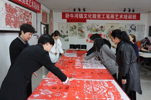 随后,一行人来到卧牛河镇文化扶贫培训班,参观并听取了卧牛河镇文化产业扶贫相关情况的介绍。展厅内,工笔画和剪纸文化脱贫培训班的学员们正跟随着老师认真的进行学习和创作。刘玉兰与授课老师及学员们进行亲切地交谈,询问老师的授课情况、学员们学习情况、作品创收情况,了解妇女学习创业情况。刘玉兰对卧牛河镇文化产业扶贫的发展现状、取得的成绩给予高度评价,特别是通过文化产业发展带动贫困户脱贫致富的有效模式,充分体现了卧牛河镇“中国民间文化艺术之乡”的产业特色。她指出要继续做好利益链接,形成品牌效应,让更多贫困户和女性同胞从产业发展中脱贫致富,得到更多实惠。