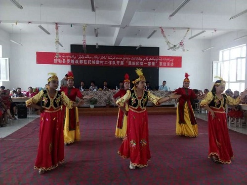 联谊活动在《民族团结一家亲》歌声中拉开帷幕。随后,维吾尔族舞蹈《我们新疆好地方》、《母亲是中华》一度将活动氛围推向高潮。民间艺人库尔班·热合买提都塔尔弹唱《感恩祖国》赢得了现场观众阵阵掌声。活动现场,还穿插了十九大及民族团结知识有奖竞答、互动小游戏等,干部群众踊跃参与,在收到礼品的喜悦中不断增进民族团结情谊。