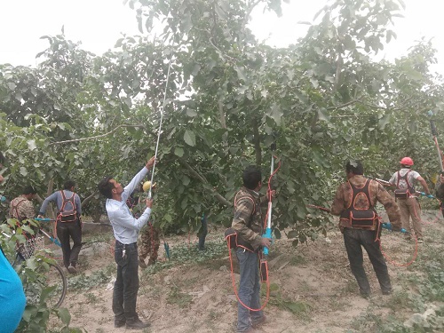 阿依巴格乡乡党委副书记、乡长阿迪力赛麦提对5、6月份梨树疏果、修剪、病虫害防治等进行了详细的讲解。