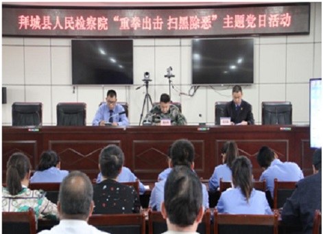 清风网讯(通讯员:拜城县人民检察院 金悦)近日,拜城县人民检察院党支部组织全院党员干部开展了以“重拳出击 扫黑除恶”为主题的党日活动。