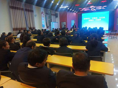 清风网讯(中国建设银行股份有限公司拜城支行驻工作队: 马生莲)2019年5月26日下午,米吉克乡一亚阔坦村村民活动中心人山人海,欢声笑语不绝于耳,一场以“学国语·比交流·促融合为主题的岗位大练兵活动正在如火如荼的进行。此活动共有参赛队员35名,分听写对抗、听写造句对抗、词语接龙、国学经典诵读、才艺展示、齐唱红歌等6个环节,评委由访惠聚队员和村干部组成。