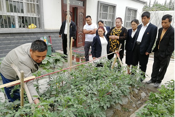 月27日,古勒巴格镇先锋村科技副职黄雨清在每周一升国旗后,组织本村村民来到大队菜地,向群众们教授西红柿、茄子、辣椒如何修枝、打叉、搭架。