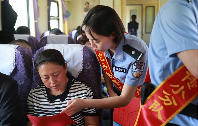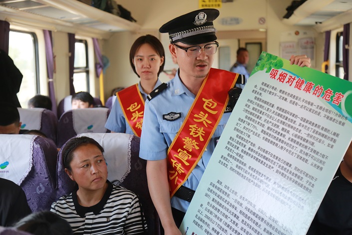 为了让旅客深刻认识到列车禁烟的必要性,民警将吸烟影响列车运行造成晚点等相关法律知识制作成展板、宣传手册等,为旅客讲解铁路禁烟管理规定和相关的处罚措施,加强旅客的禁烟意识。民警还利用列车广播加强车内禁烟宣传,在车厢醒目位置张贴禁烟标识,警示广大旅客吸烟有害身体健康。同时,与列车乘务人员一起加大列车厕所、车厢连接处重点巡视,及时劝阻违规吸烟行为,倡导大家共同营造一个无烟、清洁、健康的列车环境。