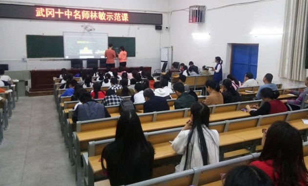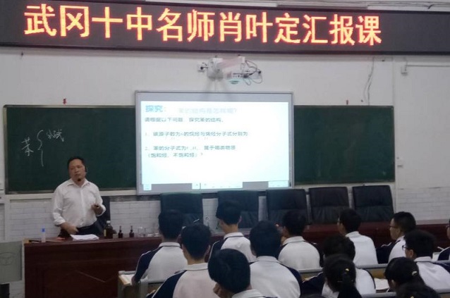 当天的名师汇报示范课,是武冈十中继5月21日名师周启动后的又一活动,首先由两位名师上示范课。肖叶定老师讲的是高中化学《苯》,循循善诱、深入浅出,在实验中寻求答案,在讲解中突破难点。林敏老师(对,就是前几天获得湖南省青年教师比武邵阳赛区第一名,将代表邵阳参加省决赛的林敏老师)则一反教学常规,她的习题讲评课由一个学生主持,学生上台讲解答案,全体学生给予评价,最后由教师给予补充的方式,一步一步把课堂推入高潮!让学生成为课堂的主人,老师只当引路人和指导者。