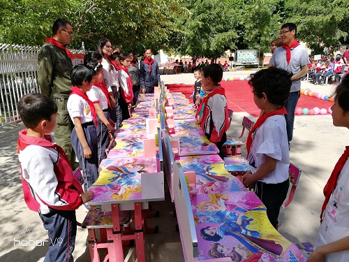 活动中,工作队给成绩优异孩子们送上了小课桌节日礼物,活动现场,孩子们脸上都洋溢着幸福的微笑,歌声、笑声、掌声、音乐声此起彼伏,汇成了欢乐的海洋。小朋友阿迪力·米吉提高兴地说:“今天我特别高兴,工作队的叔叔送给我一张小课桌,我很喜欢,今后我会更加努力学习,长大以后做一个对祖国有用的人。”