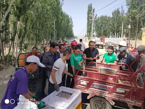 “去年在工作队的劝说下,我试养了两批油鸡(100只),我们家一年吃的鸡不算,还净挣了1500元。所以我今年这一批计划养100只。”塔西·达比提拿着等待装鸡的框子笑嘻嘻的与阿克苏地区畜牧技术推广中心领导张富全主任说着。“非常感谢你们,为了让我们能更好的养好它们,给我们培训养殖要点,手把手指导我们制作板床。我们买油鸡还给我们送油鸡、送饲料、送料筒和饮水桶。真的太感谢了。”