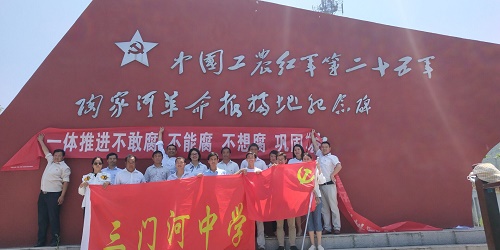 6月3日,这是一个美好的日子,三门河中学、河南畈小学、六西冲小学、东夹铺小学全体党员在中学校长邹幼玲、支书张念黄的带领下,驱车于上午11点到达英山县《中国工农红二十五军陶家河革命根据地纪念碑》前,举行六月份的支部主题党日活动。此次活动主题是:全面推行“5+X”支部主题党日模式,学条例,守初心,做习近平新时代中国特色社会主义思想践行者。