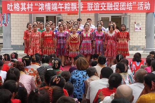 村民们一边品尝着粽子一边观看着精彩节目,“五星红旗迎风飘扬,胜利歌声多么响亮;歌唱我们亲爱的祖国,从今走向繁荣富强”,这首村民用国语演唱的《歌唱祖国》发音标准。幼儿园小朋友带来的诗朗诵,字正腔圆。阿衣努尔·艾买尔自豪地说:“看哪!领诵的是我的儿子”。由村民舞蹈队自已排练的《秧歌舞》更是赢得热烈掌声,村民自编自演的节目精彩纷呈。