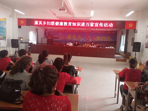 康其乡卫生院院长为群众宣讲了“预防艾滋病母婴传播”的知识,并为群众发放了宣讲手册;康其乡党委委员、宣传干事为妇女群众宣讲了“重大公共卫生妇幼项目”的知识。