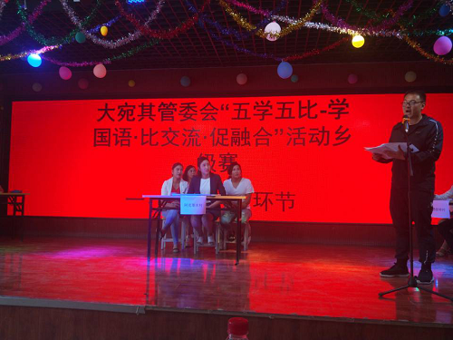 清风网讯(拜城县邮政分公司驻村工作队:艾合买提·玉素甫 穆克然·胡西塔尔)为深入推进大宛其管委会辖区的村农牧民群众和村干部学习国家通用语言,在各族干部群众中营造学国语、说国语、用国语的浓厚氛围,促进各民族交往交流,于2019年6月9日上午10:30开始拜城县大宛其管委会党建办组织开展以农牧民夜校授课内容及日常生活用语交流为主“学国语·比交流·促融合”国语乡级大赛。此次大宛其管委会辖区的5个村参加了参赛人员和群众一共450个人。每一个村组成2个参赛组,村民组和村干部组,每一个参赛组5个人,比赛以现场听写对抗环节,听词口语造句,趣味问答题环节,国语经典诵读,才艺展示环节,齐唱红歌环节等6个环节进行。经过一天时间的激烈角逐,评委们按评分标准客观、公正的打分评选出了5个村民小组一等奖村民组一名,二等奖村民组一名、三等奖村民组一名,村干部组也选出同样的一,二,三等奖村干部小组。