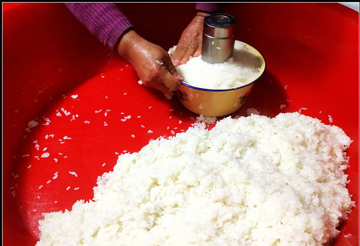 边聊边注意时间,40分钟过去,糯米蒸好了。谢彩珍开始准备盛装的大盆小盆,看着时间,她把煮好的米加进冷水,进行散热。“要过多次水,然后把米倒进一只长桶里继续散热,凉到30多度时最好,温度高会烫死酒曲,温度低又不发酵。”手在米里搅拌了几次,感觉差不多了,便开始往米里拌酒药,用力拌匀、拌透。老伴为她打下手,把拌好的米装进定制的搪瓷盆里,在盆中间挖一口“井”,门外汉只当个形状看,其实,这是给甜酒曲发酵预留呼吸的空间,以增加米饭和空气的接触面积,使好气性糖化菌生长繁殖。然后将盛好的盆端放到床上,用棉被捂得严严实实。“24小时后,就能闻到酒香,然后看到中间的米酒汩汩冒出,米又软又甜,酒又黏又香,味道绝对!”