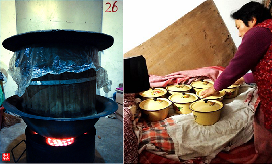 “酒药是自己加工的,也是不外传的秘方。米必须是新糯米,只有新米,出酒才多,而且口感绵软。”谢彩珍介绍说。只见他把已浸泡了12个小时的糯米洗净,放入蒸笼,然后用柴火烧。“水不能多,饭要蒸得硬一点,我这一锅15斤,水刚淹过最好。”