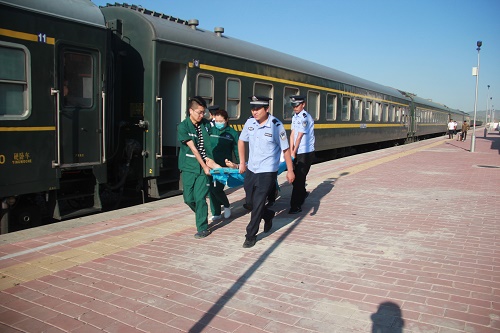 6月11日6时30分许,查布嘎所接车站通报,T301次旅客列车上有一旅客突然晕倒,需要在查布嘎站下车就医,请求民警协助。接报后,查布嘎所一面组织民警将患病旅客从列车上接下,一面打开站区紧急通道,指挥附近车辆让行,引导120急救车进入站台,并协同旅客同行家属、车站职工及120医务人员使用担架将旅客抬至救护车上。