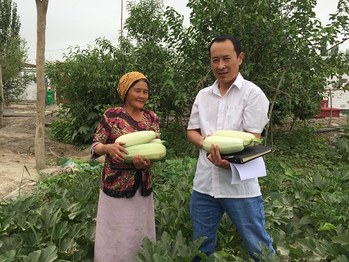 “来来来,王队长,你们来的正好,看看我家的葫芦瓜,就这一亩地的葫芦瓜到现在已经收入了4200元,往年一年到头只有卖棉花的时候才能看见钱,现在自己地里的菜也能卖出好价钱。我要管理好地里的蔬菜,争取再卖个好价钱,你再看去年嫁接的杏子树、桃子树都已经结果了,等到水果成熟了又可以卖钱,脱贫致富就靠这些瓜果蔬菜。”大妈高兴的将刚采摘下来的葫芦瓜抱在怀里,就像怀揣着致富梦想一样。