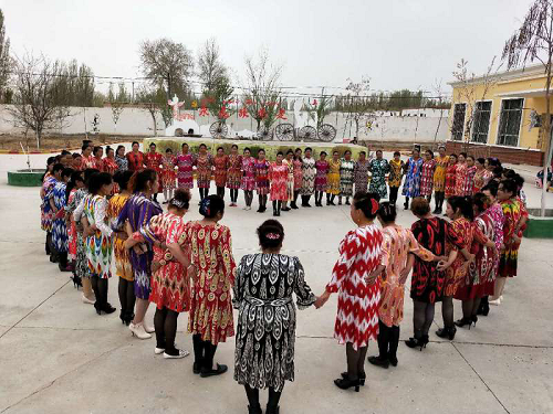 活动最后,一部分妇女群众为祖国华诞献上了自己亲手刺绣的作品,表达对党和国家的热爱。大家还一起表演了麦西来谱舞蹈、唱歌等精彩等丰富多彩的文体活动。活动结束后,奥吾其各村人大代表帕提古丽·买买提感言道:通过这次“巾帼心向党礼赞新中国”活动,使我村妇女群众进一步深深体会到党的温暖,我们现在幸福感很强,回忆以前生活,我们住的是土块房,一家人都集中住在一间卧室里,很不方便,现在已经住的是宽敞明亮的安居房,尤其是开展“三改”工作后,家里条件和城上楼房差不多,每家每人都有一间卧室,还有网络电视,各方面都很方便,日子越来越红火,这都离不开党和政府的好政策。我们要积极落实人居环境整治提出的屋内、院内三件事,展现新时代农村妇女的风采。