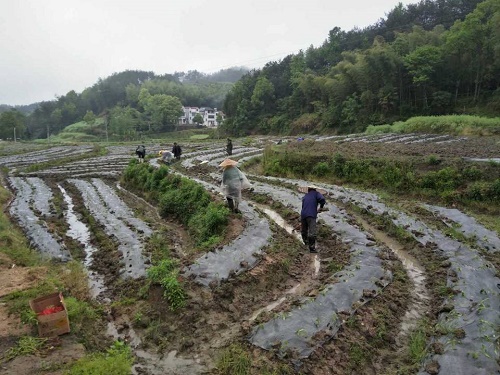 清风网讯(英山县方家咀中心小学:李永存 汪盛明 朱建明)为深化脱贫攻坚富民产业科学、规模、精准、高质量发展,持续巩固脱提升贫成效,湖北英山县方家咀乡创新产业扶贫模式,拓展产业扶贫覆盖面,逐步拓宽朝天椒产业的覆盖面,辐射带动贫困群众脱贫增收。该乡在县农业部门的支持下,将产业扶贫项目与贫困户联结起来,真正使贫困户稳定地、可持续地脱贫。今年该乡在竹元村建起了茶园套种朝天椒立体种植模式150亩。图为6月16日英山县方家咀乡竹元村农户在幼茶园里栽种朝天椒的情景。