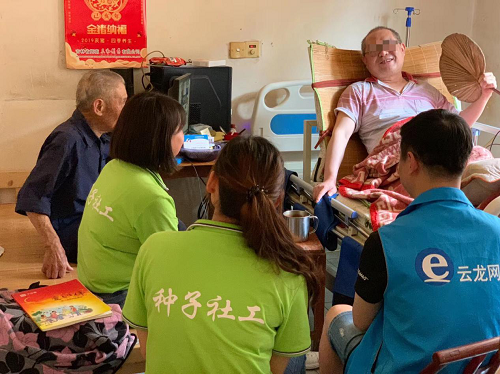 活动中,种子社工、志愿者与网格员分成6个小组,分别去到六位失能、半失能老人的家中,与其进行二对一、三对一的个案服务。陪伴过程中,小组成员们灵活运用的“爱与陪伴”十大技术,秉承专业原则,与老人促膝交谈,倾听老人心声,排解抚慰其负面情绪,让老人的情绪得以调整,精神上得以放松,在父亲节来临之际,为老人们传递了一份来自年轻一辈的温暖与关怀。