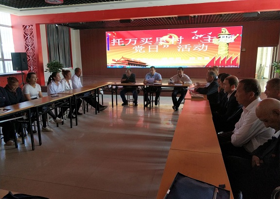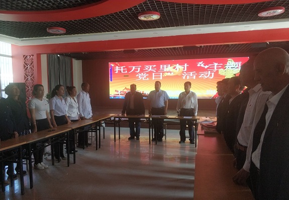 会议上45名无职党员在村第一书记阿不力克木·赛买提的号令下,奏唱国歌,重温了入党誓词,并集体诵读党章,学习了习近平总书记有关“初心工程”系列讲话精神。在“主题党日”专题讨论议程中,托万买里村党支部委员分别作了重点发言,其他同志进行了讨论发言。交纳本月党费,通报了党费交纳情况;
