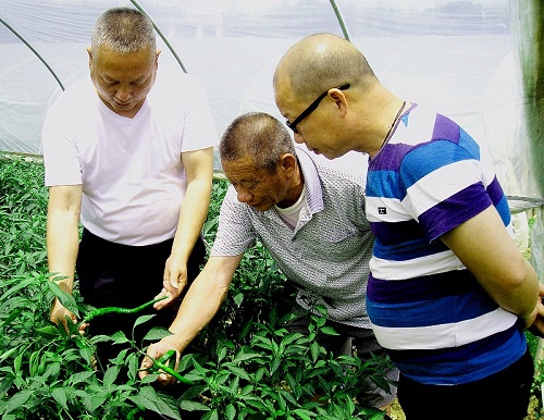 6月19日上午,湖南省新邵县陈家坊镇诚实村村支两委干部来到村民朱泽云大棚蔬菜种植基地察查了解蔬菜种植情况。今年,村民朱泽云在村支两委的引导下,通过土地流转发展大棚蔬菜种植增收,主要种植辣椒、茄子、韭菜和四季葱等蔬菜品种,种植面积30亩。目前该基地仅出售辣椒一项的收入就超过两万元。