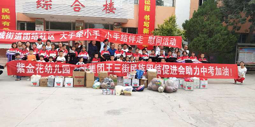 紫金花幼儿园及辖区社会爱心人士拿出资金1万多元,为镇中学21名贫困学生和残疾儿童购买了学习用品和生活用品,并亲手为孩子们发放了书包、校服、铅笔、文具盒等学习用品及残疾人辅助器,并勉励他们要自立自强、努力学习,以优异的成绩报答父母、报答老师;将来更好地报效祖国,回报社会,建设自己的家乡。孩子们拿到礼物十分高兴,纷纷表示一定会将爱牢记心中,用知识充实头脑,用智慧改变自己,改变命运,为实现自己的梦想和伟大的中国梦而努力拼搏,长大后做一个对家乡、对祖国、对人民有用的人。最后,该校领导还与社区共同商讨了今后如何加强联系共建,做好帮扶工作的具体措施。
