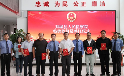 清风网讯(拜城县人民检察院政工科: 袁文广 杨洁)为进一步推进全面从严治检,畅通检察机关接受外部监督渠道,搭建沟通交流桥梁,准确把握人民群众关切,推进我院检察工作取得新发展。2019年6月21日下午,拜城县人民检察院举行特约监督员聘任仪式。