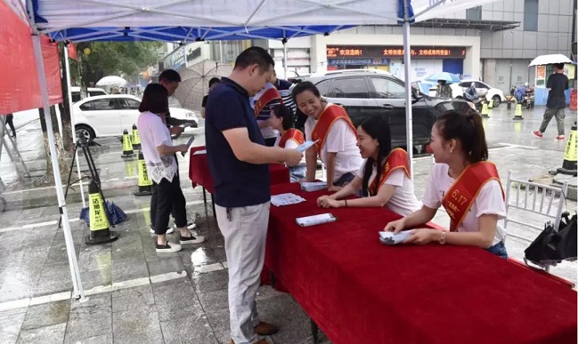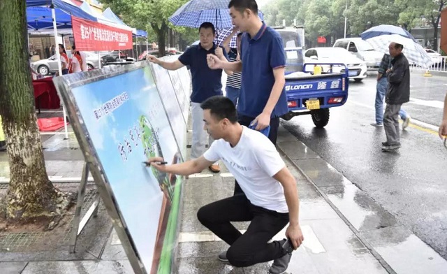 天公不作美,17日一早便淅沥沥地下起雨来。“防沙治沙本就是与天抗争,不能妥协”,绵绵细雨也没有阻挡林业人对防治荒漠化和沙化的执着,局领导当机立断,决定如期开展活动。在东方盛世白马服饰广场,30余名干部职工迅速忙活起来,男同志三两成组,拖的拖桌子、搭的搭棚子、搬的搬展板,建好了活动场地“硬件设施”;女同志负责“软件”,戴上宣传绶带、打着雨伞向过往行人、路边商户发放宣传手册,并为咨询的路人解惑释疑。虽头顶大雨,但活动场面仍是一片热火朝天,2个多小时共发放宣传手册450余份,咨询台接待行人150余人;有效提升了社会对防治荒漠化和土地沙化现象的关注度和认识度。