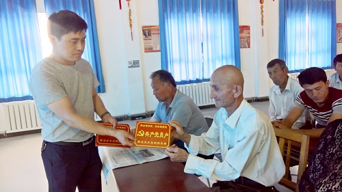 清风网讯(沙雅县人民政府办公室驻村工作队:逯亚辉)为深化“两学一做”学习教育,提升学习教育实效,6月22日,沙雅县古勒巴格镇阿克艾日克村党支部将统一制作的“共产党员户”门牌发放到农牧民党员手中,以门牌亮明党员身份,增强农村党员荣誉感、归属感和身份认同感,激励广大党员发挥先锋模范作用。