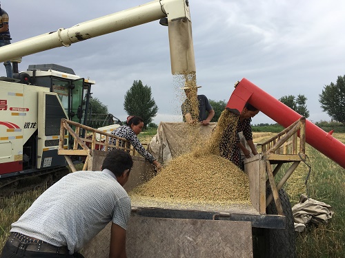 为了进一步提高收割效率,工作队、村两委积极联系协调5台收割机进村同时作业,抢收小麦。目前,玉斯屯克塔木托格拉克村1870亩小麦正在收割,已经收割870亩,预计还有三天完成。