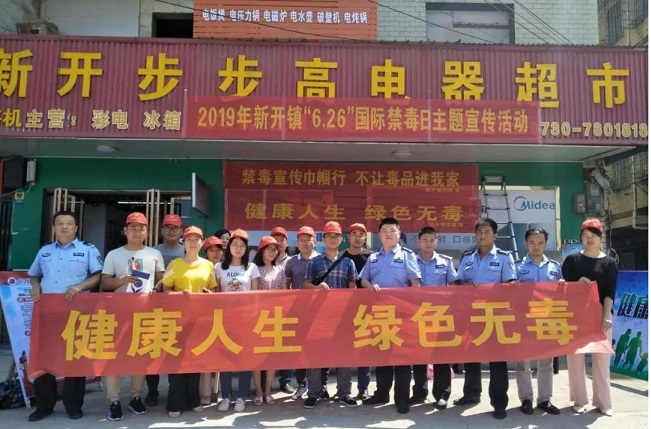 清风网岳阳讯(廖立霞 许萍) 6月26日是国际禁毒日,新开镇司法所、综治办、派出所、妇联等联合举办了“健康人生、绿色无毒”的宣传进小区、进集镇活动。