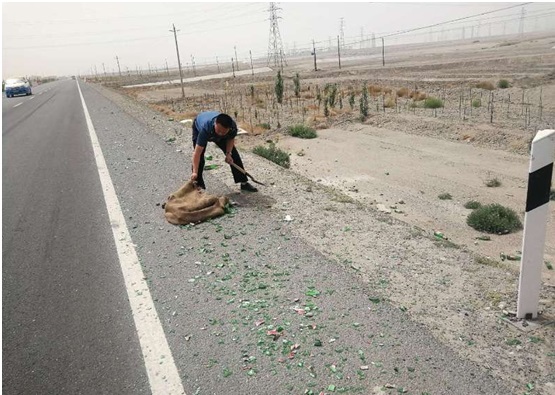 清风网讯(乌什路政管理局:陆健 贾国明)近日,乌什路政管理局路政人员在巡道至S306线K8+550米发现下行方向应急车道内有一片较长的玻璃碎渣区域。经乌什局路政人员下车实地勘验,发现该碎玻璃区域长约10米,初步判断为过往车辆掉落的啤酒瓶造成的。该碎玻璃区域位于应急车道内,对过往车辆的行车安全构成较大的威胁,为确保过往车辆的行车安全,乌什局路政人员从执法车上取来铁锹和扫把等工具将玻璃碎渣清扫干净,清除了这一安全隐患。