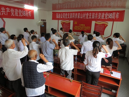 清风网讯(湖北英山县:童曙明 胡吉)6月29日,为庆祝建党98周年,湖北泓达船舶科技有限公司党支部和大山深处的湖北英山县金家铺镇李家山村党支部联合开展庆祝建党98周年活动,金家铺镇镇长胡凤平、温泉镇副镇长王红年及联村干部石飞、税务局驻村干部朱继承等领导参加,泓达公司董事长江献文带领15名党员与李家山村党支部共50多名党员参加了活动。