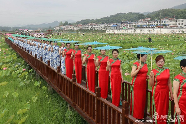上午七时半,来自各行各业的150名女性,穿着花式多样的旗袍,在荷花园的观景走廊,踏着优美的弦律,进行了长达一个多小时的旗袍展演。随后,在斗米畈村文化广场表演了大型文艺节目,用舞蹈、歌曲等文艺形式,热情讴歌党的正确领导、庆祝党的98岁生日。