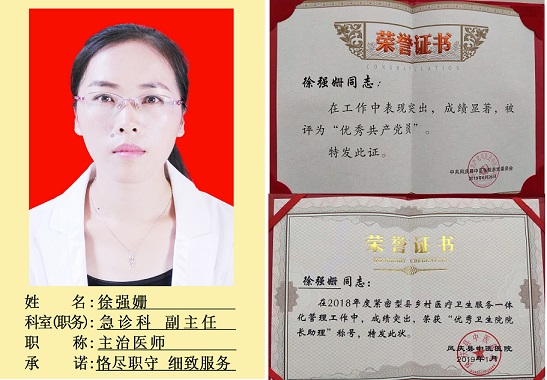 徐强姗,女,1985年10月出生,汉族,云南省凤庆县人,大学本科学历。2007年毕业于云南中医学院,同年10月响应国家“三支一扶”号召,到沧源县佤族自治县佤医佤药研究所支医,2008年参加事业单位考试进入勐省中心分院工作,2013年11月调入凤庆县中医医院。先后担任凤庆县中医医院内科支部书记、急诊科副主任、小湾分院院长助理,2018年荣获紧密型医疗卫生服务一体化“优秀分院院长助理”称号,2019年被评为“优秀共产党员”,作为一名党员,她时刻谨记全心全意为人民服务的宗旨,入党以来处处以共产党员的标准严格要求自己,立足本职,爱岗敬业,恪尽职守,诚恳待人,团结协作,积极发挥党员的先锋模范作用。