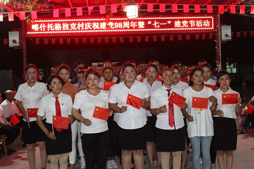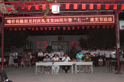 活动以全体起立奏唱国歌拉开序幕。接着村党支部书记艾则孜·热合曼介绍了建党的历史,宣讲了在党的带领下我们生活发生的巨大转变,号召广大党员干部群众要“感党恩、听党话、跟党走”,为构建和谐美好家乡贡献力量。随后开始文艺活动,村民组织的合唱队带来了《没有共产党就没有新中国》《我的中国心》等红歌,村里的老人合唱团为大家带来红歌《东方红》,赢得大家热烈的掌声。看完演出后,有村民激动地说:“今天是党的98岁生日,我特别高兴,今天组织的活动很有意义,我们一定要感谢党、跟党走”。