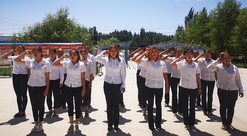 在“七一”建党节来临之际,拜城县温巴什乡吉格代力克村老党员带领新党员重温入党誓词。