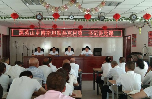 博斯坦铁热克村第一书记吐尔逊·肉孜讲党课,今天的党课内容是《党的历史》,让每个党员通过听党课正确认识和对待党的历史的重要性,正确认识和把握党的历史发展的主题和主线,