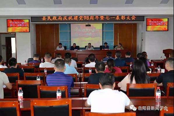 清风网岳阳讯 (陈再兴 许萍) 6月26日下午3点,岳阳县民政局举行庆祝建党98周年暨七一表彰大会,民政局党组全体成员、局机关和各二级机构全体党员参加会议,会议由党组副书记、副局长许波主持。