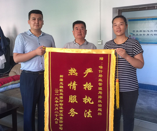 7月4日,新疆五联欧亚国际物流有限责任公司为喀什路政管理局路政治超科送上“严格执法,文明服务”的锦旗,表对我局执法人员尽职尽责、优质高效、勤勉为民的工作态度表示肯定、连连称赞,我局执法人员用他们的实际行动诠释了路政执法“内强素质 外塑形象 文明执法 热情服务” 的服务宗旨,为打造“阳光执法、公正执法、文明执法”形象树立了良好的榜样,一面锦旗,不仅是对我局优质、耐心、热忱服务的肯定,更是对我局全体执法人员的鞭策和激励,我局将继续积极践行“不忘初心、牢记使命”的理念,把荣誉化作前行的动力,履行好保路护航执法为民的责任和使命!