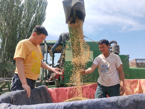 3组村民阿布都热合曼·木沙高兴地说:“麦收的季节,我家劳动力少,秋收时节忙不过来,多亏王书记帮忙联系收割机来收割,感谢驻村工作队!感谢党和政府!”欧勒旁村种植的2134亩小麦,每亩预计产量500公斤,今年农民的小麦喜获丰收。