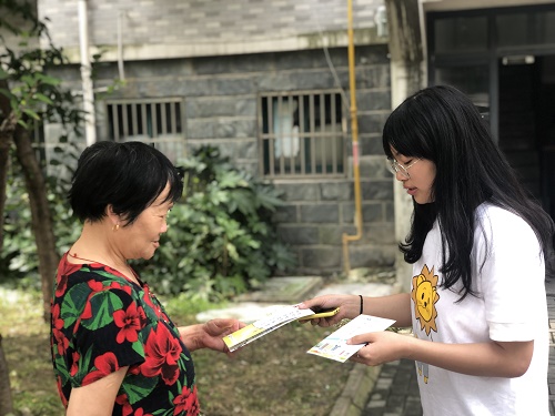 队员们分成几组,向过路的居民发放禁毒防艾的宣传手册并讲解有关毒品和艾滋病的基本知识。在此过程中,有位奶奶在接过宣传册后说:“我看不来,我不识字,我拿回去,让我儿子读给我听。”社区居民随机的简单采访反映了居民们对禁毒防艾的关切以及其宣传的重要性,更是折射出社会对于此方面的积极配合,从志愿者角度来说,群众的关心和配合是宣讲活动进行的动力。