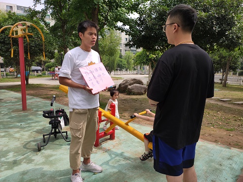 上午十点,成员们准时到达社区。社区负责人表示十分欢迎志愿者学生走进社区,给社区居民普及禁毒知识,提高居民的认知程度,促进和谐社区构建。在活动开始,团队成员走进社区老年活动中心,大爷大妈们十分热情地配合我们的宣传和问卷调查,并且十分坚定地告诉成员们自己对于此方面态度,坚决杜绝毒品,为了自己和家人的健康、也为社会的健康发展。