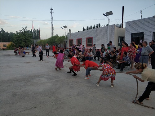 “加油!加油!加油!…”7月7日晚9点半,拜城县大宛其管委会托万买里村村委会院子里助威呐喊声此起彼伏。来自各村民小组的群众分成四组进行了拔河比赛,一次次激烈而振奋人心的比赛在大家欢呼声中进行着,伴随着呐喊声,参赛群众倾尽全力与对手顽强拼搏。