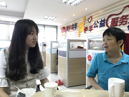 梅女士热情接待了来访的志愿者团队,并表达自己对于大学生志愿者主动奉献爱心做公益行为的肯定和赞扬。志愿者们围绕“滴水公益”的活动原则、活动主要内容、自身定位以及未来展望这四个方面进行采访。