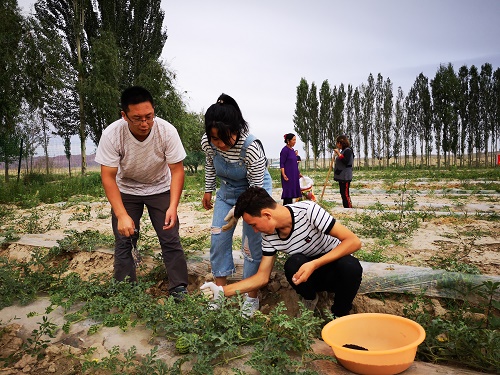 7月9日至10日,在两天时间里,共计18名返乡学生和全体驻村工作队员来到田间地头,俯下身子,在村扶贫示范果园开展志愿活动,帮助贫困户为西瓜施肥,以实际行动助力脱贫攻坚工作。
