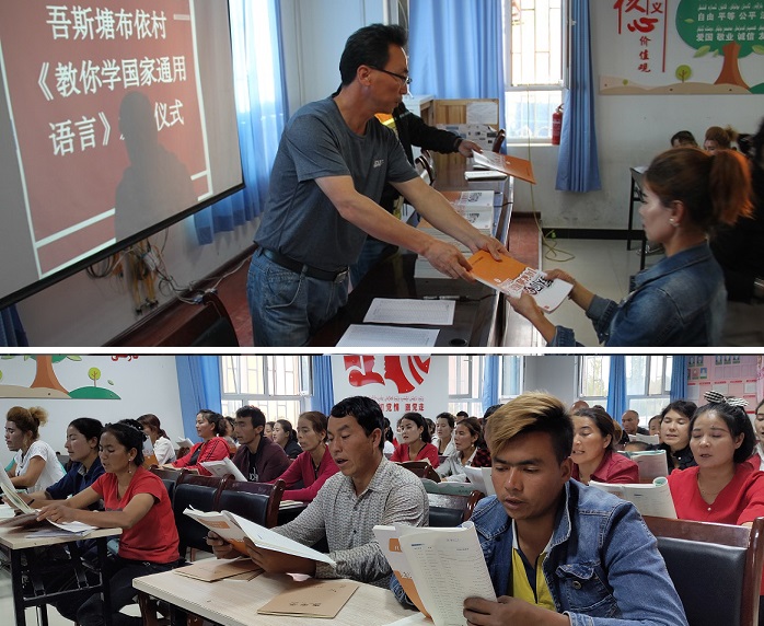 清风网讯 (拜城县人民检察院: 时建磊 )为进一步提高村民的国家通用语音水平,拜城县人民检察院驻察尔齐镇吾斯塘布依村工作队购买了《教你学国家通用语音》丛书,为每户村民免费赠送一本,该书以阿里木这一进城务工青年为主人公,突出“情景会话、即学即用”的特点,力求使农牧民学习国家通用语音更加贴近生活、更加实用便捷。同时, 利用村组干部专班、农牧民(快、中、慢)班分类教育的方法,对不同人群中制定不同教学计划,营造浓厚学习氛围,不断加大国语的教育、学习、交流力度,引导群众主动学国语、用国语、懂国语,提升对国家、中华民族和中华文化的认同。